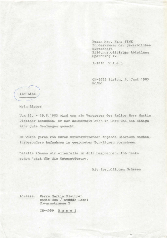 Letter from Daniel Sommer to Mag. Hans Fink, 06/06/1983.