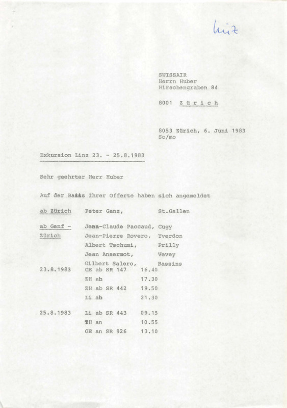 Subject: Participant registrations and flight details for the Linz excursion, 23–25 August 1983. - Date