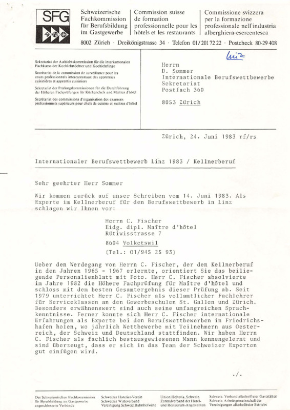 Subject: Appointment of Mr. C. Fischer as Expert for the Restaurant Service skill competition at the 27th International Vocational Training Competition, Linz 1983 - Date