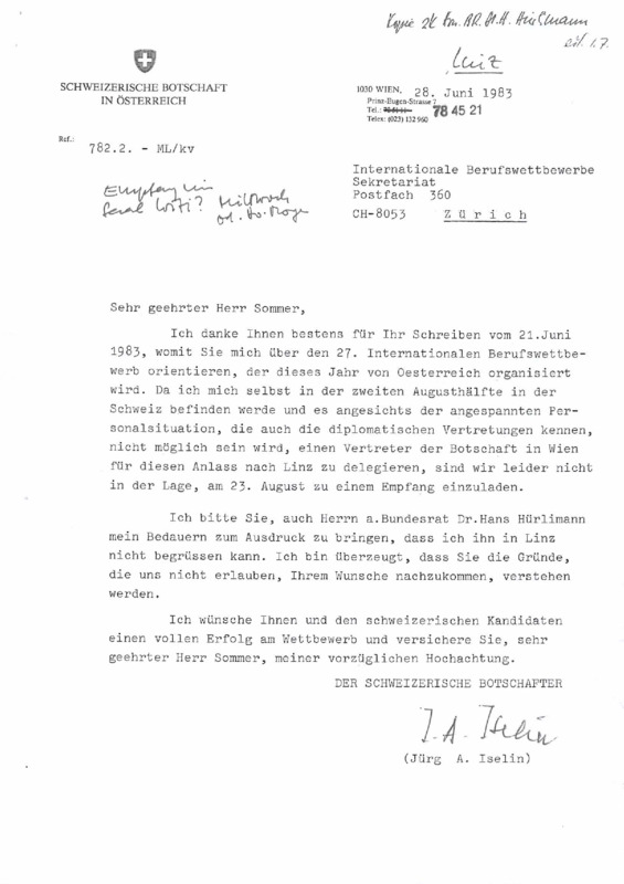 - Letter from Swiss Ambassador in Austria (Jürg A. Iselin) to Daniel Sommer, 28/06/1983