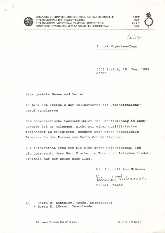 Subject: Introduction of Restaurant Service as a demonstration skill in 27th International Vocational Training Competition, Linz 1983, and nomination of Mr. Conrad Fischer as Swiss Expert. - Date