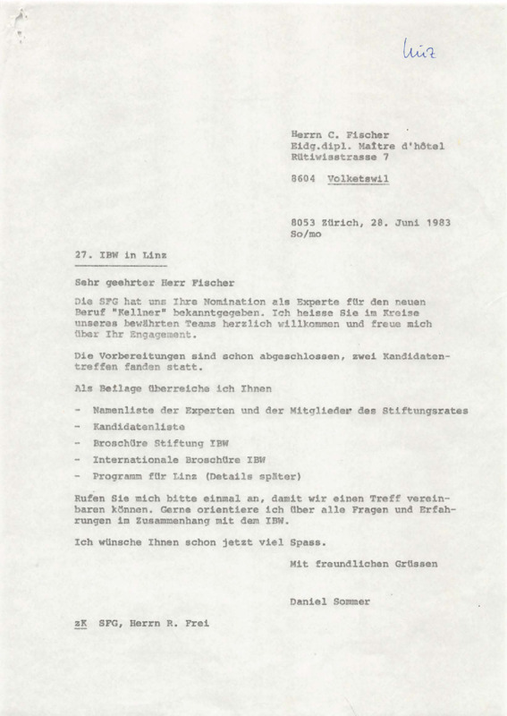 Subject: Welcome and information package regarding his nomination as Expert for the new demonstration skill "Restaurant Service" at the 27th International Vocational Training Competition, Linz 1983 - Date