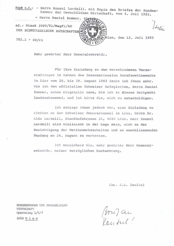 - Letter from Swiss Ambassador in Austria (Dr. J.A. Iselin) to the Secretary General of the Austrian Chamber of Commerce, 12/07/1983