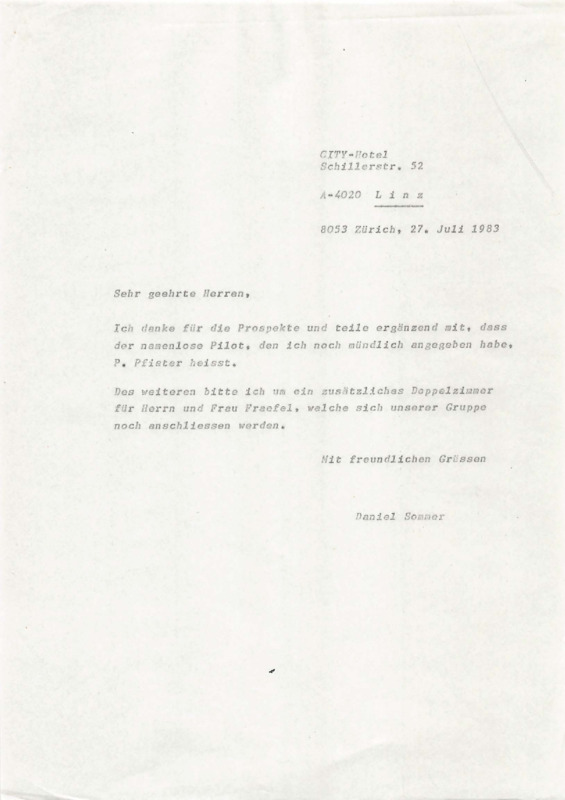 Letter from Daniel Sommer to City-Hotel Linz, 27/07/1983.