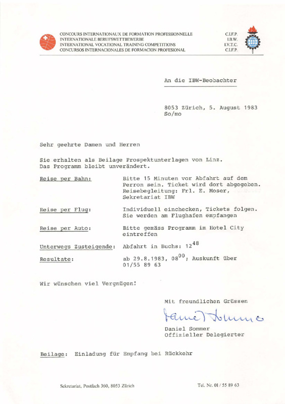 Subject: Final travel instructions and information for participants in the Observer programme for the 27th International Vocational Training Competition, Linz 1983 - Date