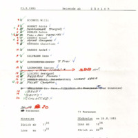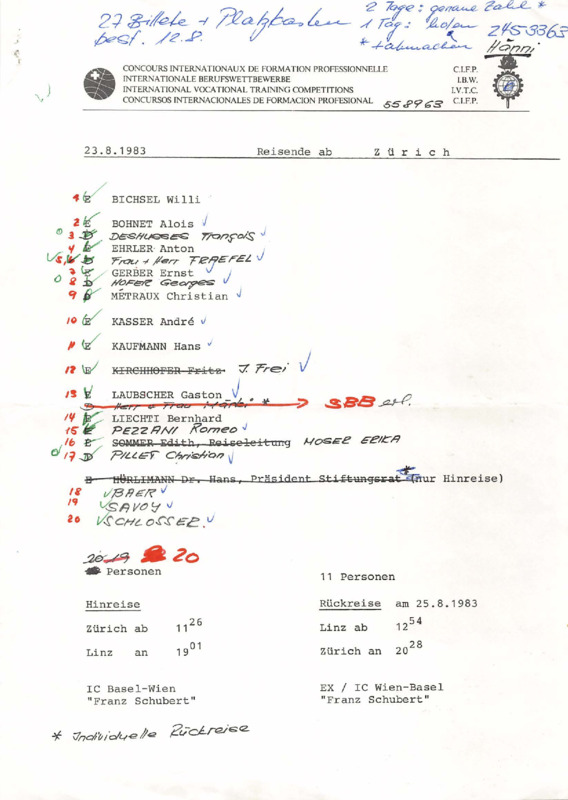 - Document dated 23 August 1983 listing travel details of Swiss participants attending the 27th International Skills Competition in Linz. Includes names of travelers, departure locations (Zurich, Buchs, Geneva), modes of transport (train and flight), and schedules for both outbound and return journeys. Total of 40+ individuals across multiple groups.