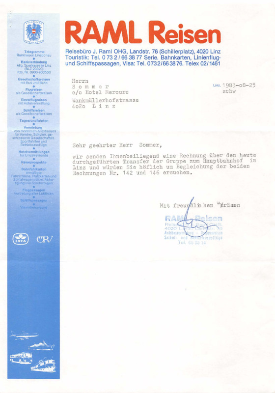 Letter from Reisebüro J. Raml OHG to Daniel Sommer, 25/08/1983