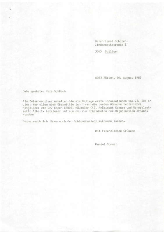 Letter from Daniel Sommer to Ernst Schürch, 30/08/1983.