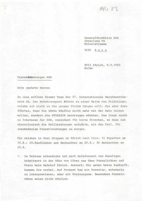 Subject: Feedback and detailed complaint regarding logistical and pricing issues experienced by the Swiss delegation during train travel to the 27th International Vocational Training Competition, Linz 1983. - Date