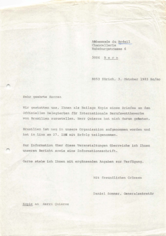 Subject: Forwarding a copy of correspondence addressed to Brazil’s Official Delegate at the International Vocational Training Competitions, and informing about Brazil’s successful participation in the 27th International Vocational Training Competition, Linz 1983 - Date