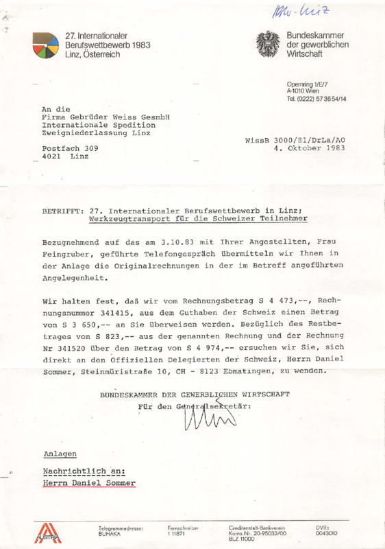 Subject: Tool transport for Swiss participants in the 27th International Vocational Training Competition, Linz 1983; partial invoice payment confirmed, with instructions to contact Daniel Sommer for the outstanding balance. - Date