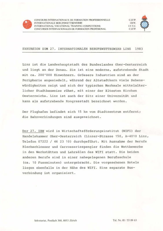 - Information brochure issued by Daniel Sommer on 12 April 1983 for the Observer excursion to Linz. Includes background on the host city, competition venues, programme schedule from 23–25 August, travel options (train and flight), costs, registration instructions, and insurance notes for participants.