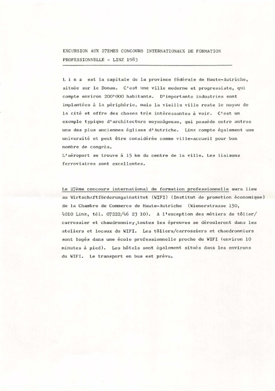 - Information brochure issued by Daniel Sommer on 12 April 1983 for the Observer excursion to Linz. Includes background on the host city, competition venues, programme schedule from 23–25 August, travel options (train and flight), costs, registration instructions, and insurance notes for participants.