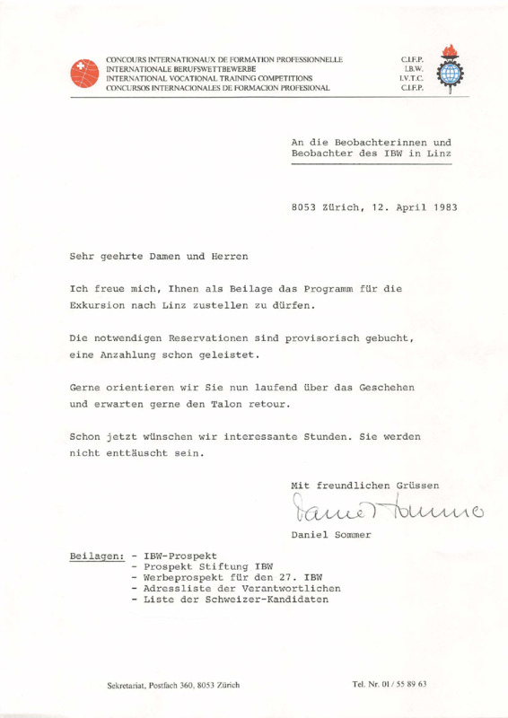 - Letter from Daniel Sommer to the observers of the 27th International Vocational Training Competition, Linz 1983, 12/04/83 (DE)