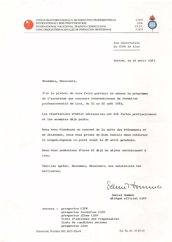 - Letter from Daniel Sommer to the Observers of the 27th International Vocational Training Competition, Linz 1983 (FR)
