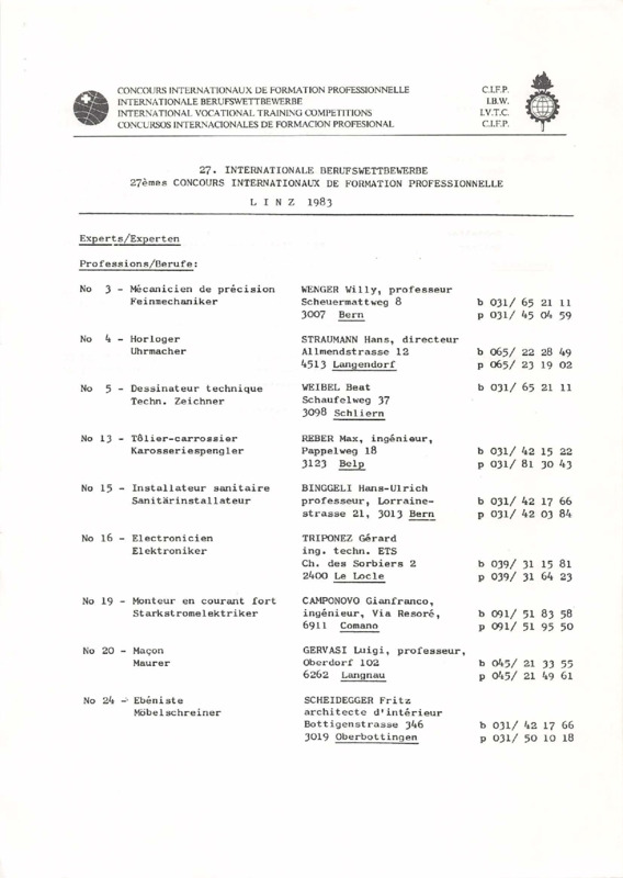 - Official list of Swiss Experts designated for the 27th International Vocational Training Competition, Linz 1983. Includes names, professions, addresses, and contact details of Experts , as well as the designated team leader.