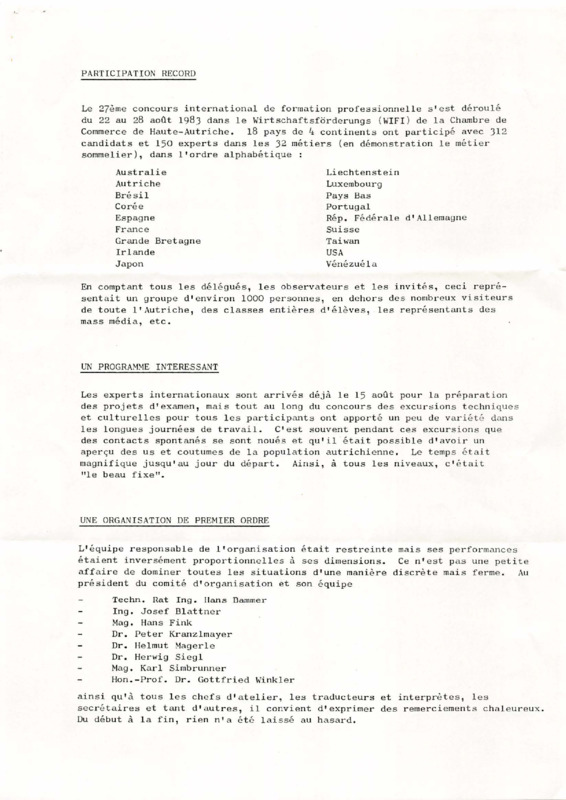 - Anonymous report summarizing the 27th International Vocational Training Competition, Linz, 22 to 28 August 1983. Includes statistics on participating countries, Competitors, and skill competitions; descriptions of the event program, host city, venue (WIFI), and key meetings. Highlights include structural changes in the organization, upcoming competitions in Japan and Australia, and reflections on the exchange of ideas, media presence, and the evolution of vocational training systems.