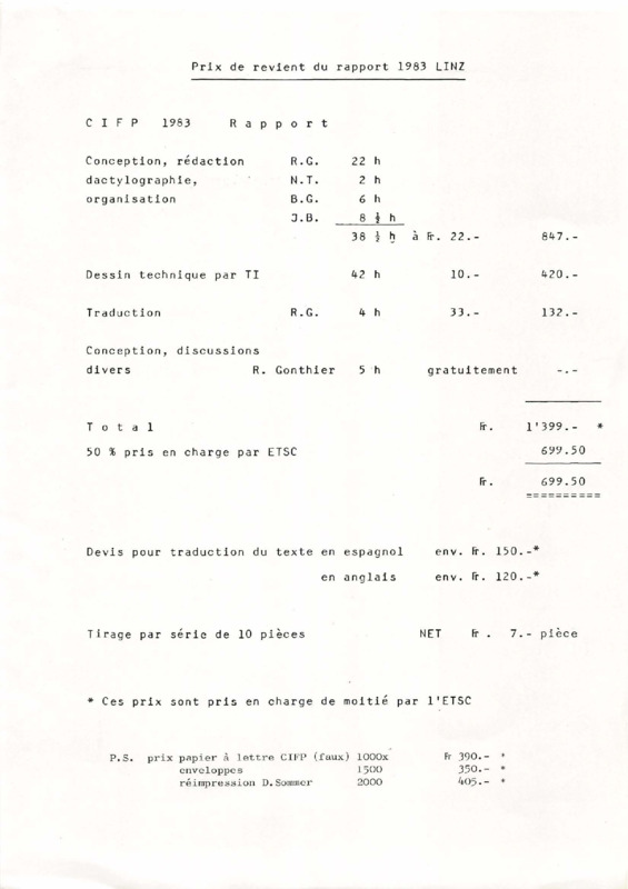 - Document detailing the production costs of the 1983 Linz report, including hours spent on writing, editing, design, translation, and printing. Provides estimated costs for translations into Spanish and English, print runs, and associated materials. Indicates that 50% of the costs were covered by ETSC.