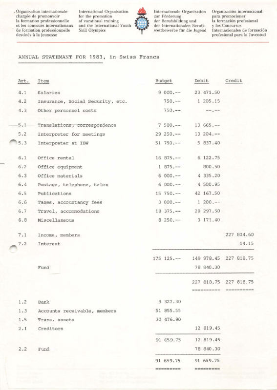 - Detailed financial report for the year 1983, presented in Swiss Francs. It includes a breakdown of budgeted and actual expenses and income, a balance sheet, and extensive commentary on financial operations in Madrid, Linz, and Zurich. Topics covered include salaries, translation and interpretation costs, office expenses, travel, and membership contributions. It also addresses accounting challenges, currency losses, and outstanding payments. The report is signed by Daniel Sommer.