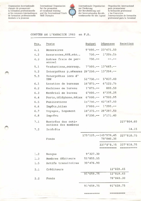 - Detailed financial report for the year 1983, presented in Swiss Francs. It includes a breakdown of budgeted and actual expenses and income, a balance sheet, and extensive commentary on financial operations in Madrid, Linz, and Zurich. Topics covered include salaries, translation and interpretation costs, office expenses, travel, and membership contributions. It also addresses accounting challenges, currency losses, and outstanding payments. The report is signed by Daniel Sommer.