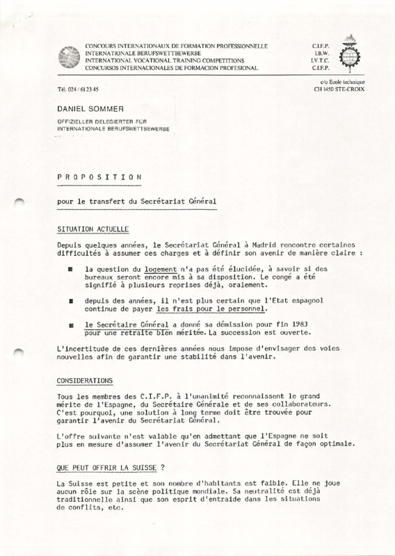 - Document outlining Switzerland’s official offer to take over the General Secretariat of the International Vocational Training Competitions. Presented by Daniel Sommer on 9 January 1983, the proposal details the challenges facing the Madrid-based Secretariat, Switzerland’s strengths and neutrality, the services it can provide, and its readiness for a smooth transition.
