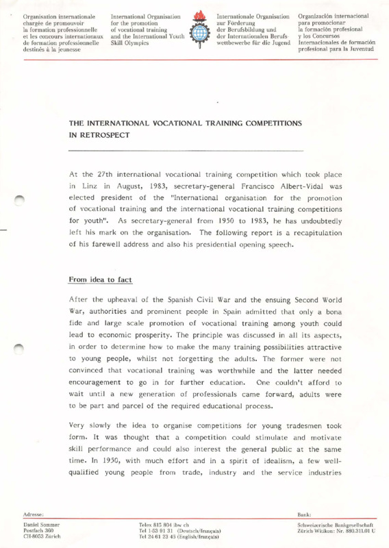 - A detailed retrospective written by Francisco Albert-Vidal in August 1983, summarizing his final speech as Secretary General and inaugural address as President of the International Organization. The document recounts the history of the CIFP from its inception in 1950 through the 27th competition in Linz, covering milestones such as international expansion, technical standardization, and the transfer of the Secretariat from Madrid to Zurich. It concludes with acknowledgements of contributors from many countries.