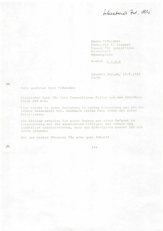 - Letter from Josef Rössler to Rudolf Trauner (President of the Chamber of Commerce for Upper Austria), 12/09/1983