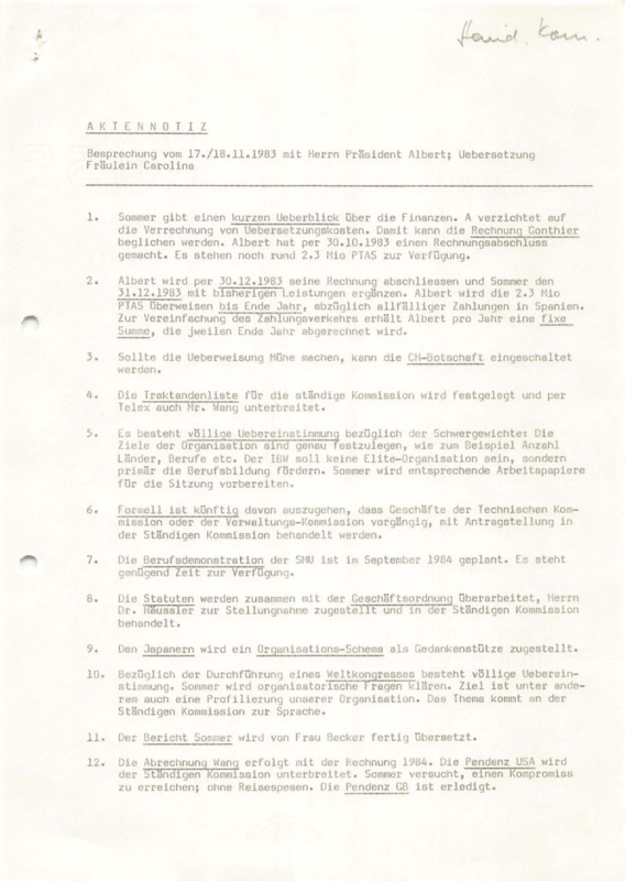 - Internal summary of a meeting between President Francisco Albert Vidal and Daniel Sommer discussing financial matters, agenda planning for the Standing Commission, updates on statutes and regulations, World Congress preparations, honorary memberships, country contacts, and organizational goals. Includes decisions on translations, documentation, and budget planning for 1985.