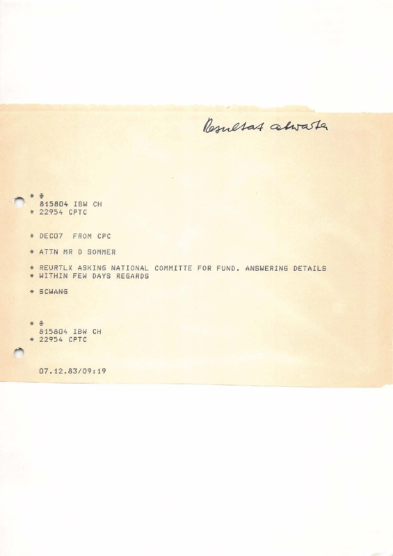 - Telex from Mr. Scwang to Daniel Sommer, 07/12/1983