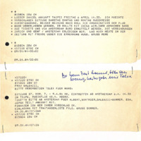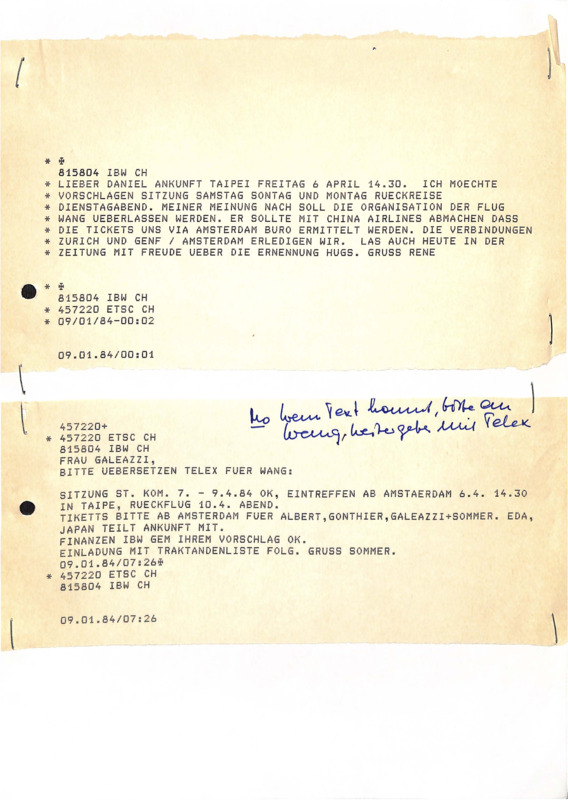 Telexes coordinating logistics for the Standing Commission meeting in Taipei, including proposed dates (6–10 April 1984), travel arrangements via Amsterdam, ticket issuance by China Airlines, and confirmation of financial matters. Also includes a request for Frau Galeazzi to translate and forward the message to Mr. Wang. - Date