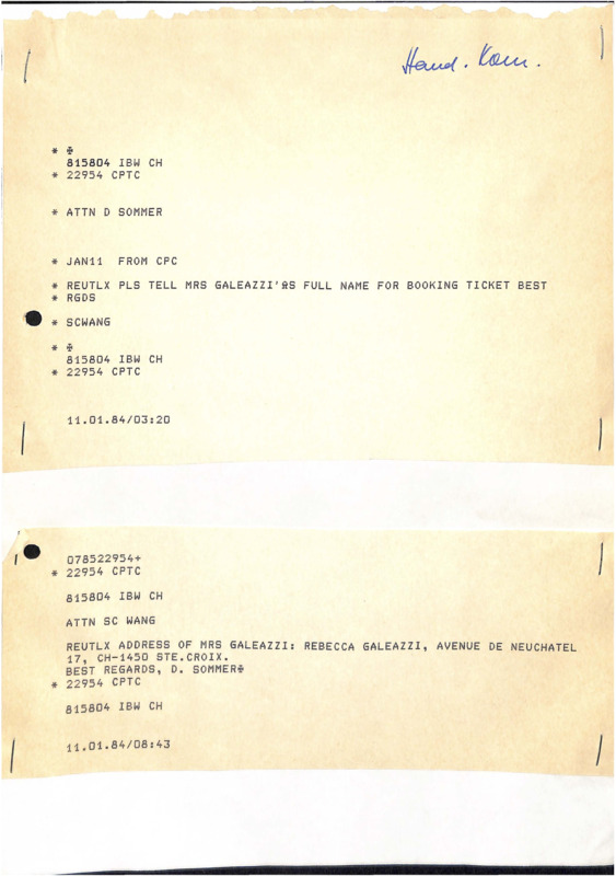 - Exchange of telex between SC Wang and Daniel Sommer, 11/01/1984