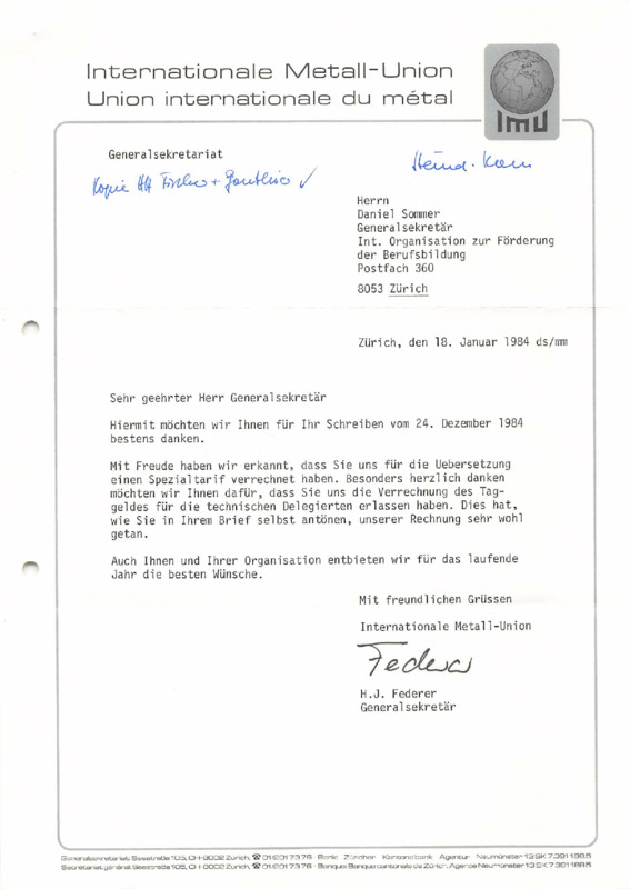 - Letter from H.J. Federer (Secretary General, Internationale Metall-Union) to Daniel Sommer, 18/01/1984