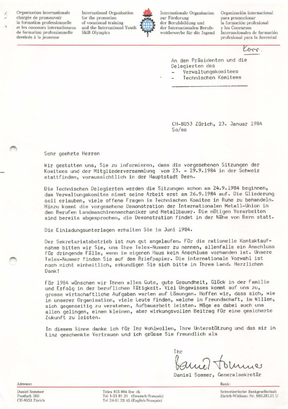 - Letter from Daniel Sommer to Delegates of the Administrative and Technical Committees, 23/01/1984 (DE)