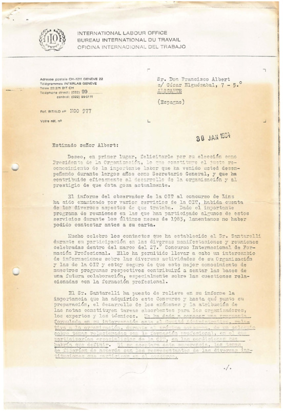 - Letter from Allan Salt (Head of the Vocational Training Service, International Labour Organization) to Francisco Albert Vidal, 24/01/1984