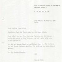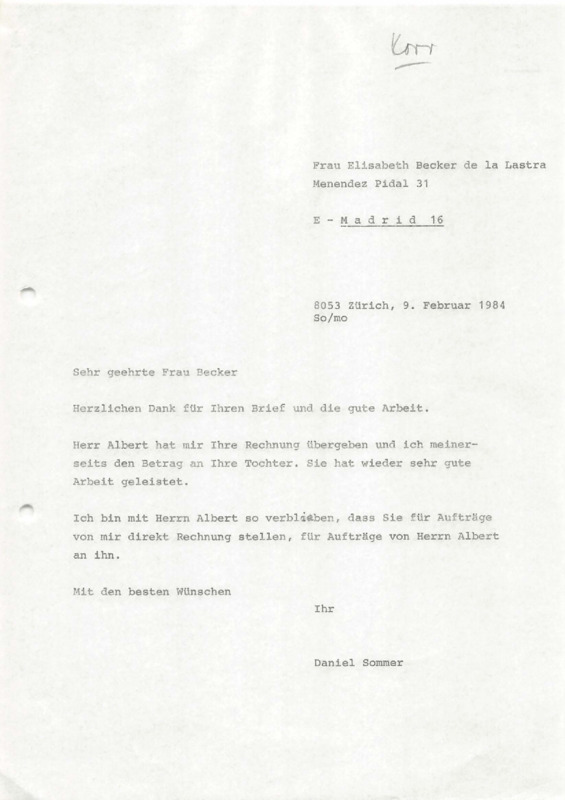 - Letter from Daniel Sommer to Elisabeth Becker de la Lastra, 09/02/1984