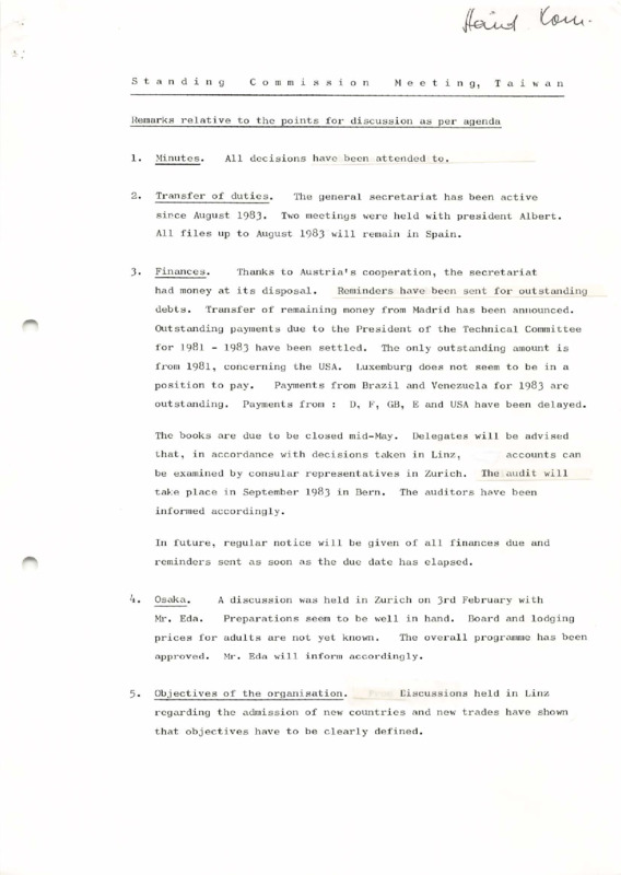 - Internal notes outlining remarks and proposals for each agenda item discussed during the Standing Commission meeting held in Taipei. Topics include finances, Osaka preparations, organizational objectives, constitution revision, plans for the 1986 World Congress, honorary members, and international contacts.
