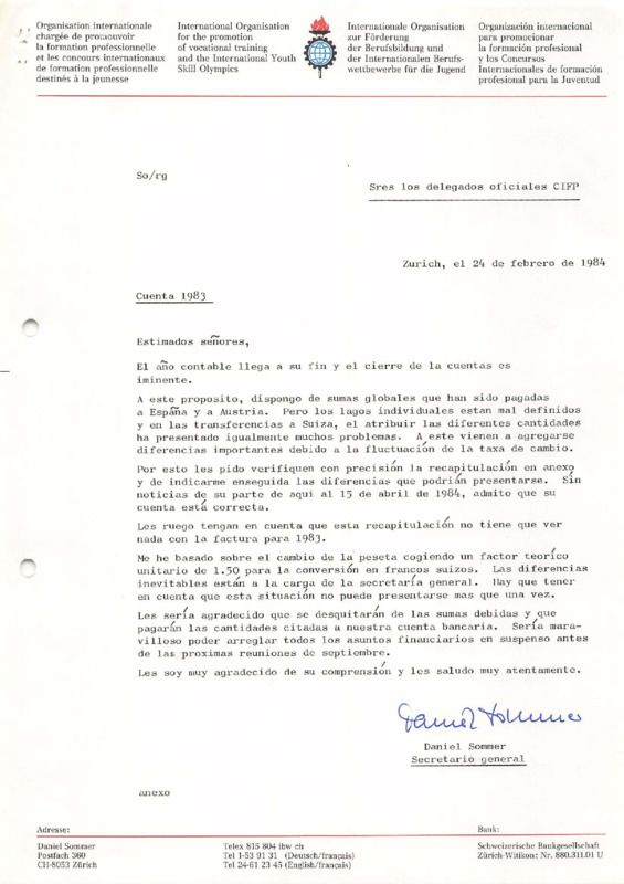 - Letter from Daniel Sommer to Official Delegates, 29/02/1984 (ES)
