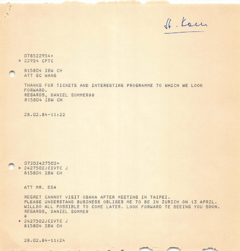 - Exchange of telex between Daniel Sommer and S.C. Wang / Mr. Eda, 28/02/1984