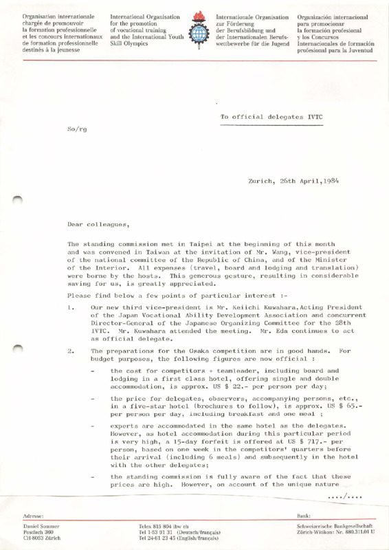 Letter from Daniel Sommer to Official Delegates IVTC, 26/04/1984 (EN)