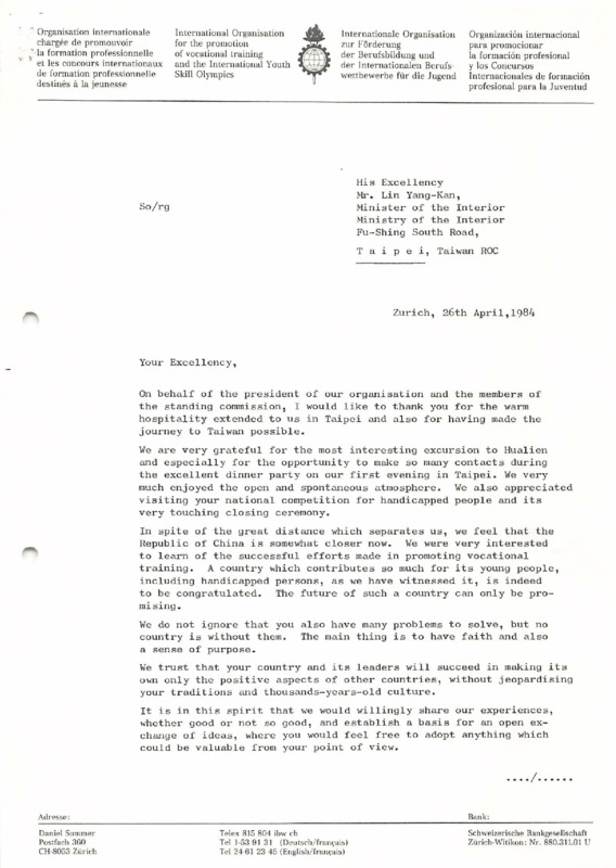 - Letter from Daniel Sommer to His Excellency Mr. Lin Yang-Kan (Minister of the Interior, Taiwan), 26/04/1984 (EN)