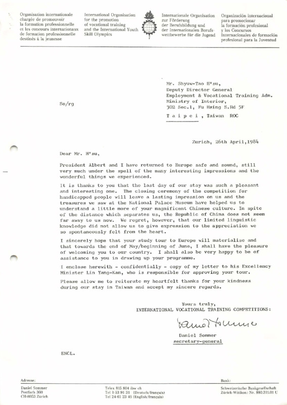 - Letter from Daniel Sommer to Mr. Shyuw-Tao H'su, 26/04/1984 (EN)
