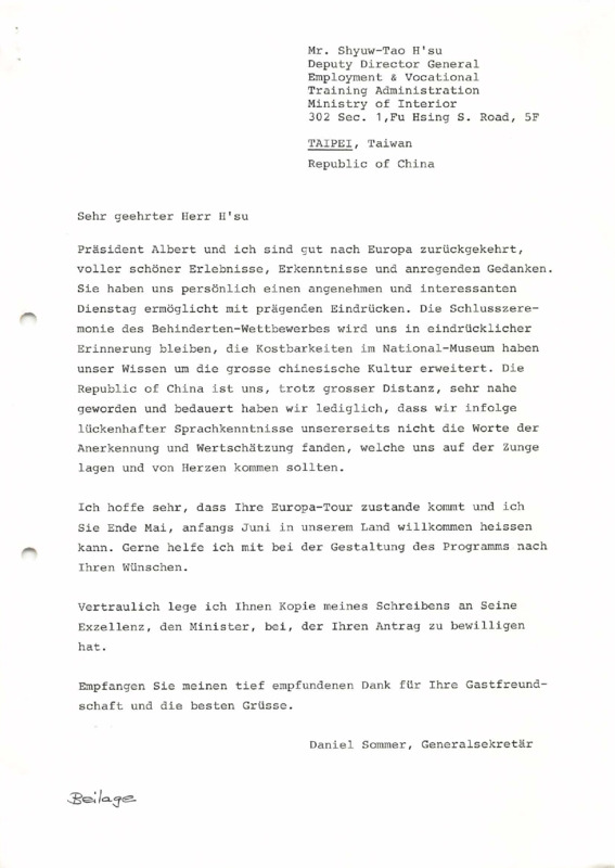 Subject: thanks for making the last day in Taipei pleasant and memorable, including the closing ceremony of the competition for handicapped people and visit to the National Palace Museum; expresses hope to welcome him during planned study tour to Europe in late May/early June and offers assistance with programme; mentions enclosed confidential copy of letter to Minister Lin Yang-Kan, not included in the document. - Date
