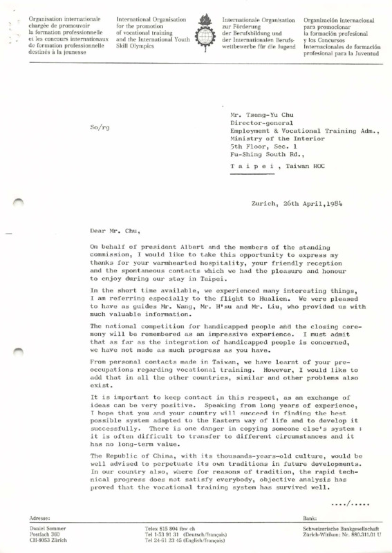 Subject: thanks for hospitality and exchange of ideas during the Standing Commission visit to Taipei, reflections on the national competition for handicapped people, and discussion of vocational training challenges; shares insights from the Swiss system and advises preserving Chinese traditions while adapting to modern needs; offers further exchange of ideas. - Date