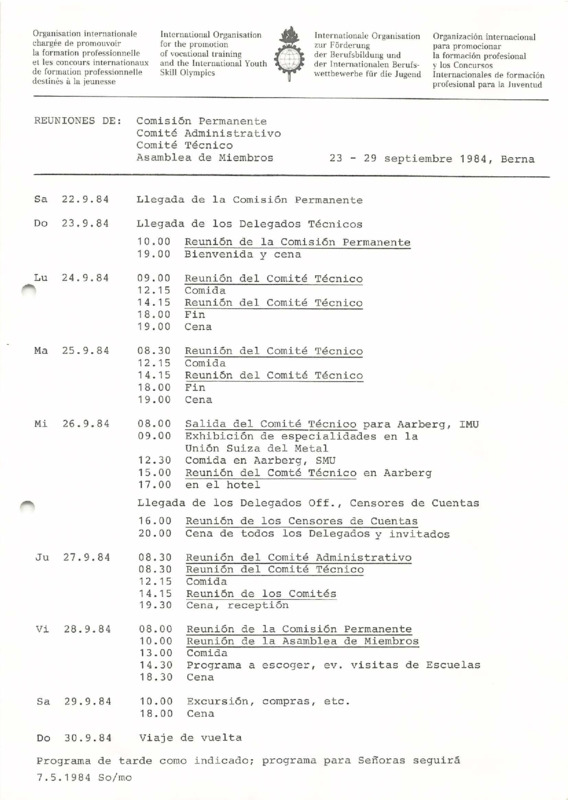 - Programme for the Standing Commission, Technical Committee, and General Assembly meetings, Bern, 23–29/09/1984 (ES)
