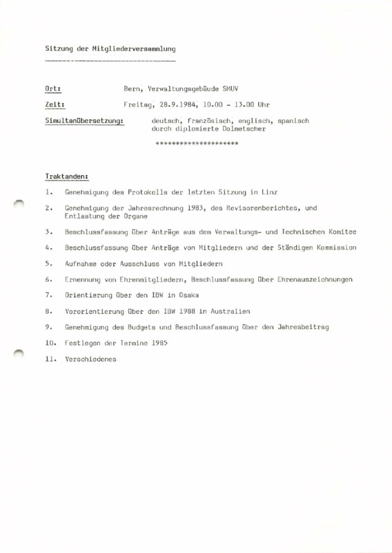 - General Assembly meeting agenda, Bern 28/09/1984