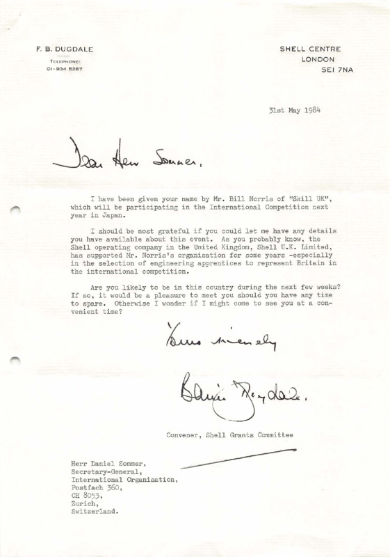 - Letter from F. B. Dugdale (Convener, Shell Grants Committee, Shell UK Limited) to Daniel Sommer, 31/05/1984