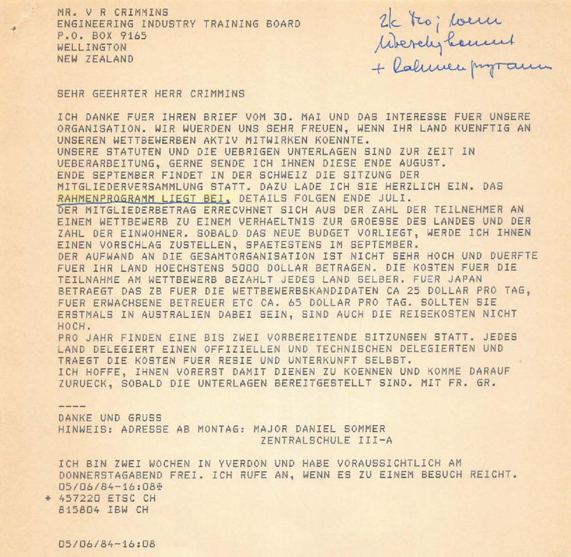 Letter from Daniel Sommer to V. R. Crimmins (Engineering Industry Training Board, New Zealand), 05/06/1984
