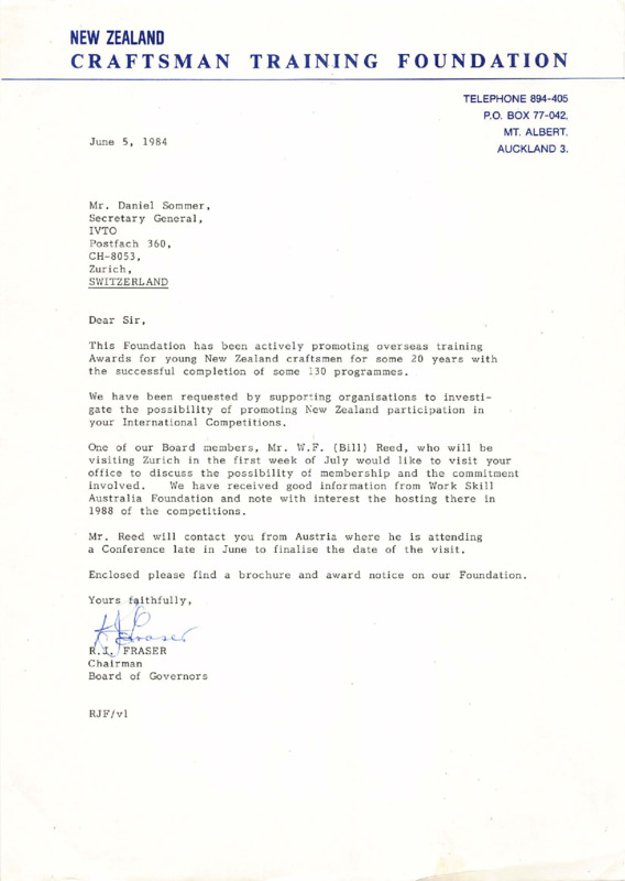 Subject: Request to discuss the possibility of New Zealand participating in the international competitions; mentions visit by Board member W.F. Reed to Zurich in July, information received from Work Skill Australia Foundation, and enclosures with a brochure and award notice on the Foundation (not included in the document). - Date