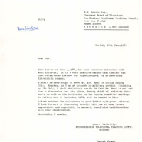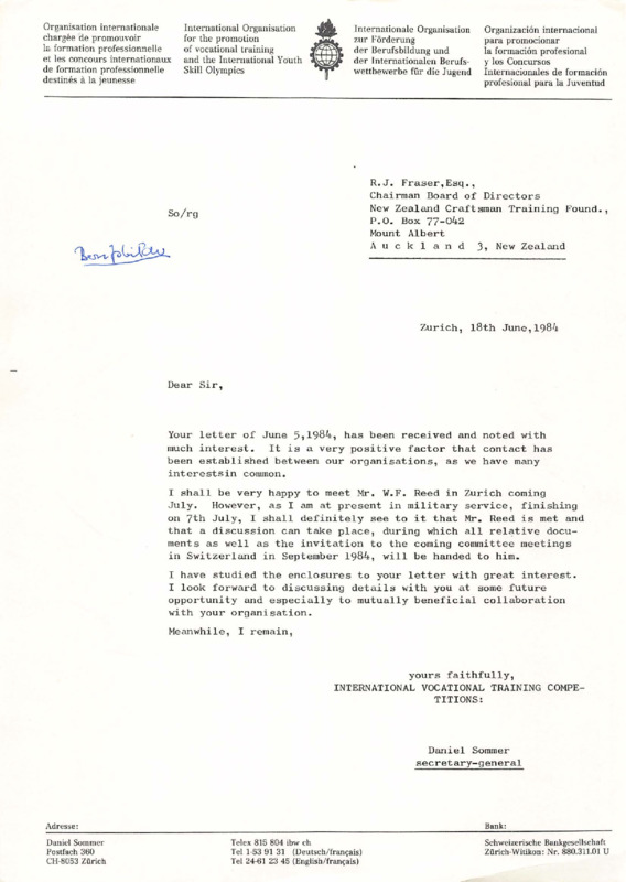 - Letter from Daniel Sommer to R.J. Fraser (Chairman, Board of Directors, New Zealand Craftsman Training Foundation), 18/06/1984