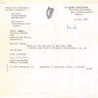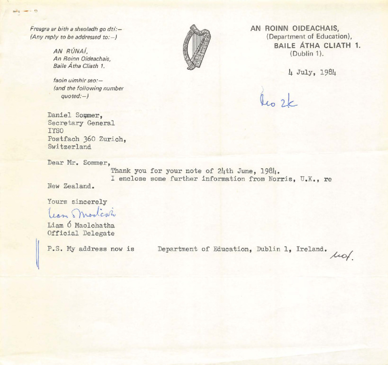 - Letter from Liam Ó Maolchatha (Official Delegate, Ireland) to Daniel Sommer, 04/07/1984